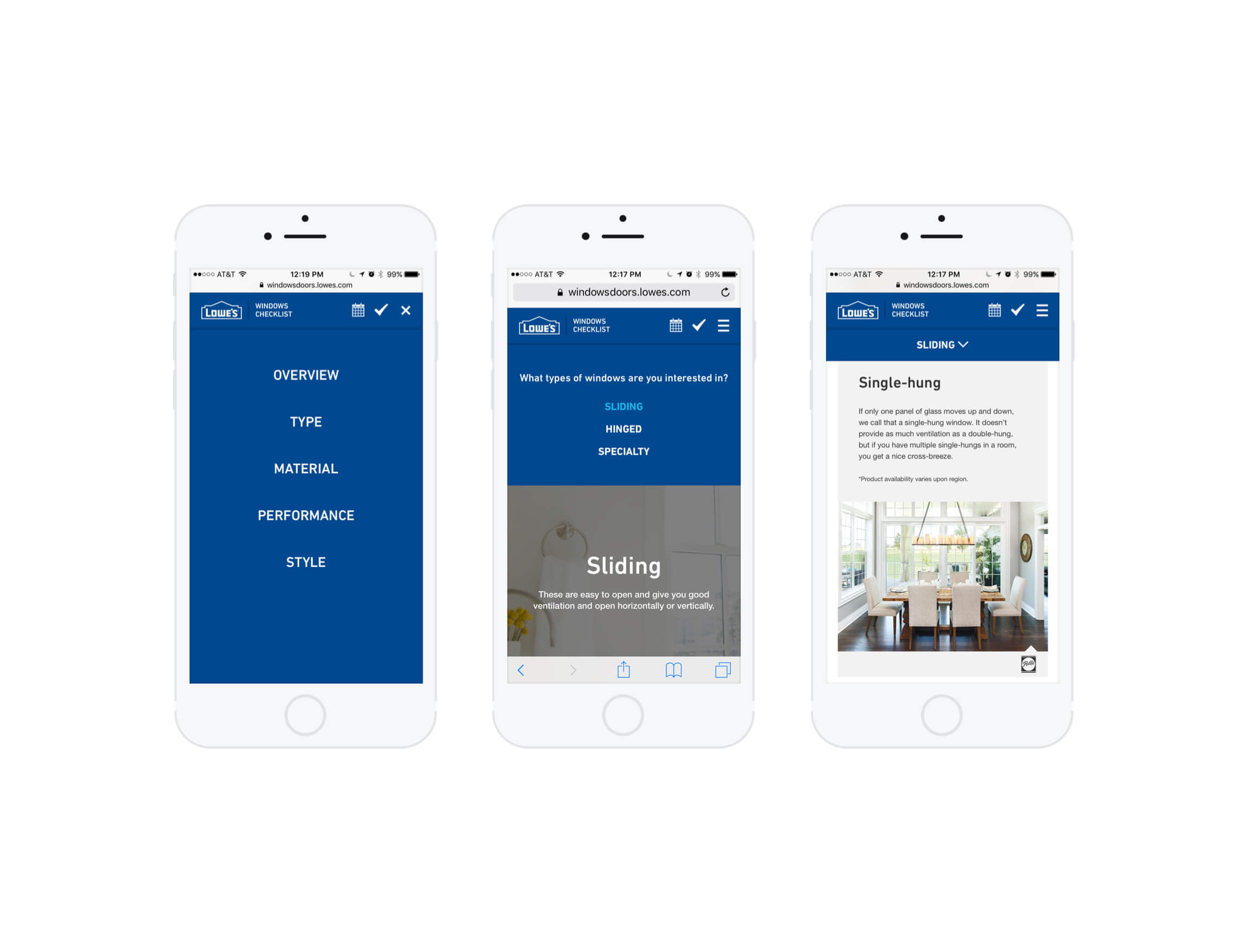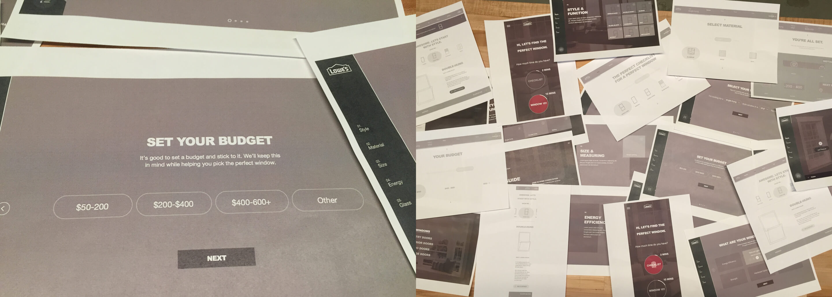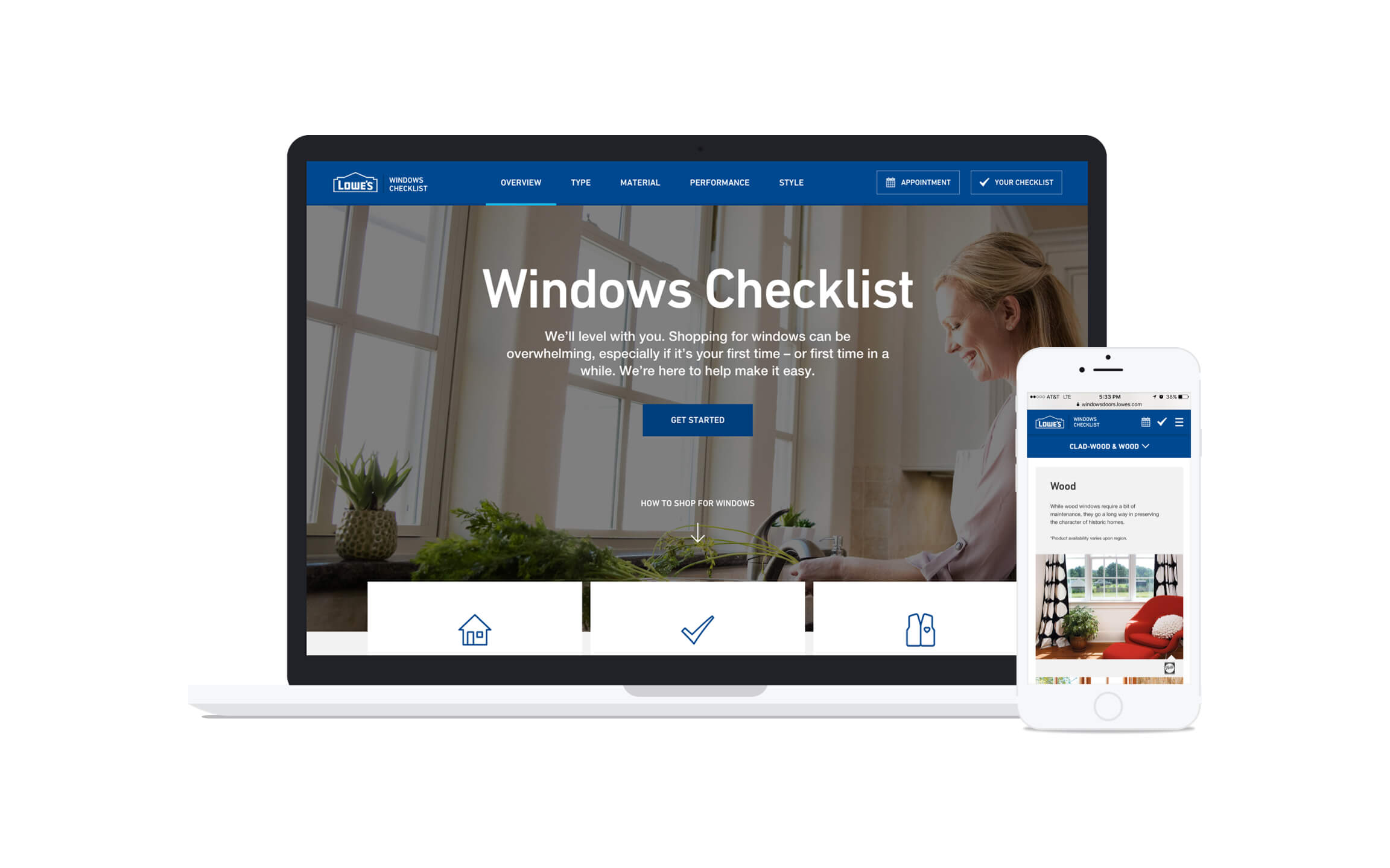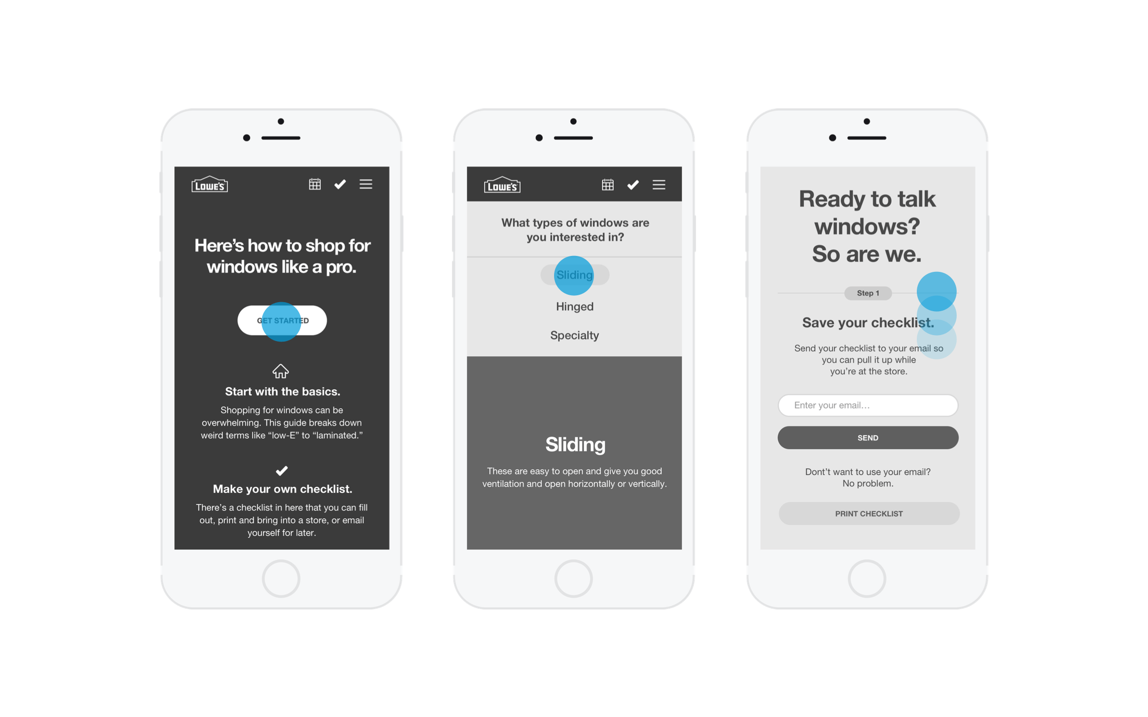 Through customer research and stakeholder workshops, we realized that shopping for windows and doors can be an overwhelming experience. With high uncertainty, users preferred going in-store to truly evaluate the look and feel of their window or door. As the majority of users start their research online, we identified key entry points into the experience. We created a simple, responsive guide that provided a balance between form and function, style and utility. Through a lightweight experience, we broke down primary and secondary buying factors. We focused on translating highly technical terms into user-centric language. Allowing customers to take a mobile checklist along with them, we provided a “soft landing” into a local Lowe’s store where they could confidently share ideas and buying preferences with a Lowe’s expert.