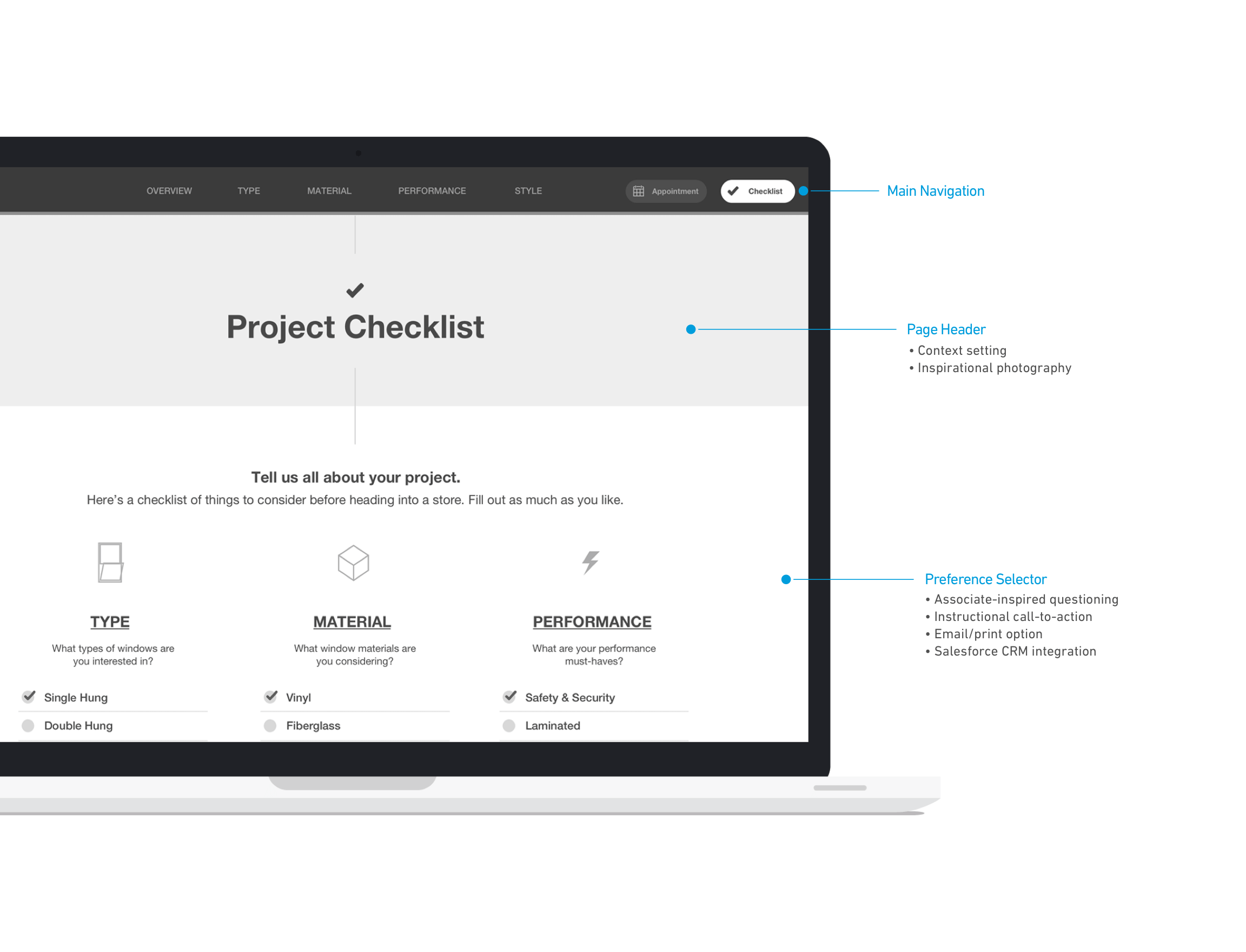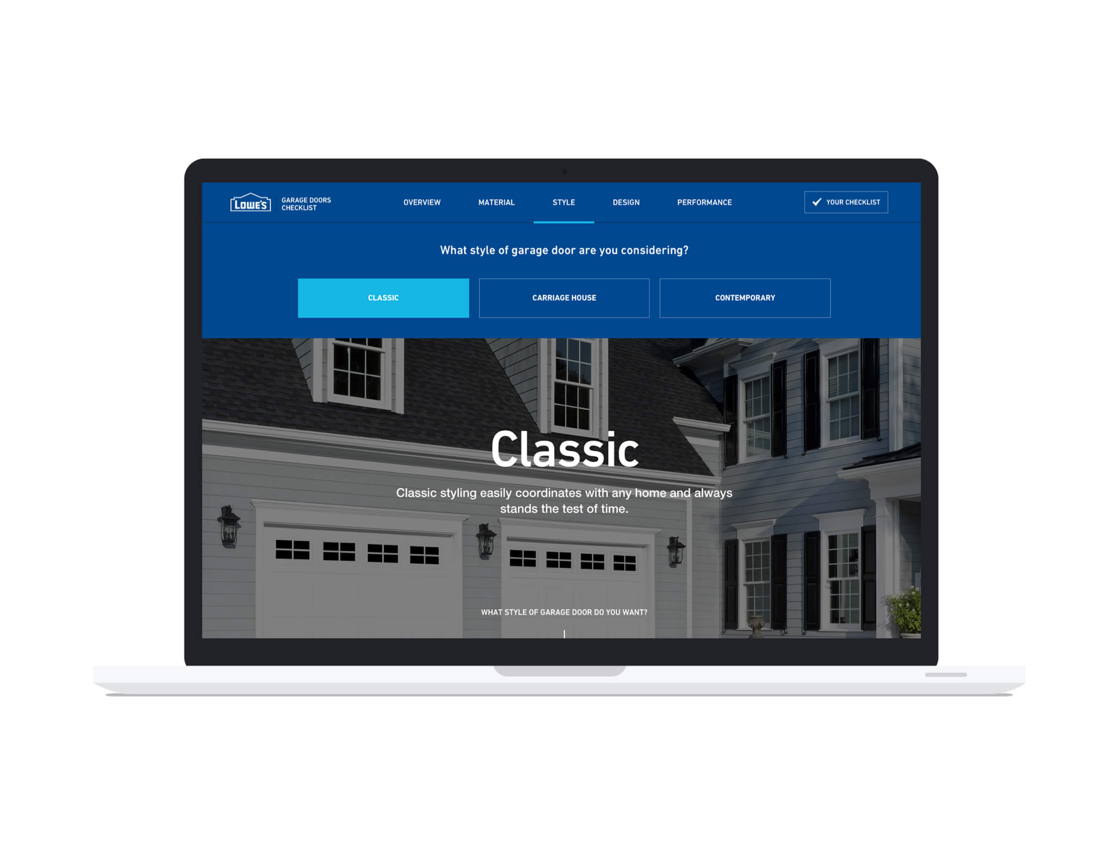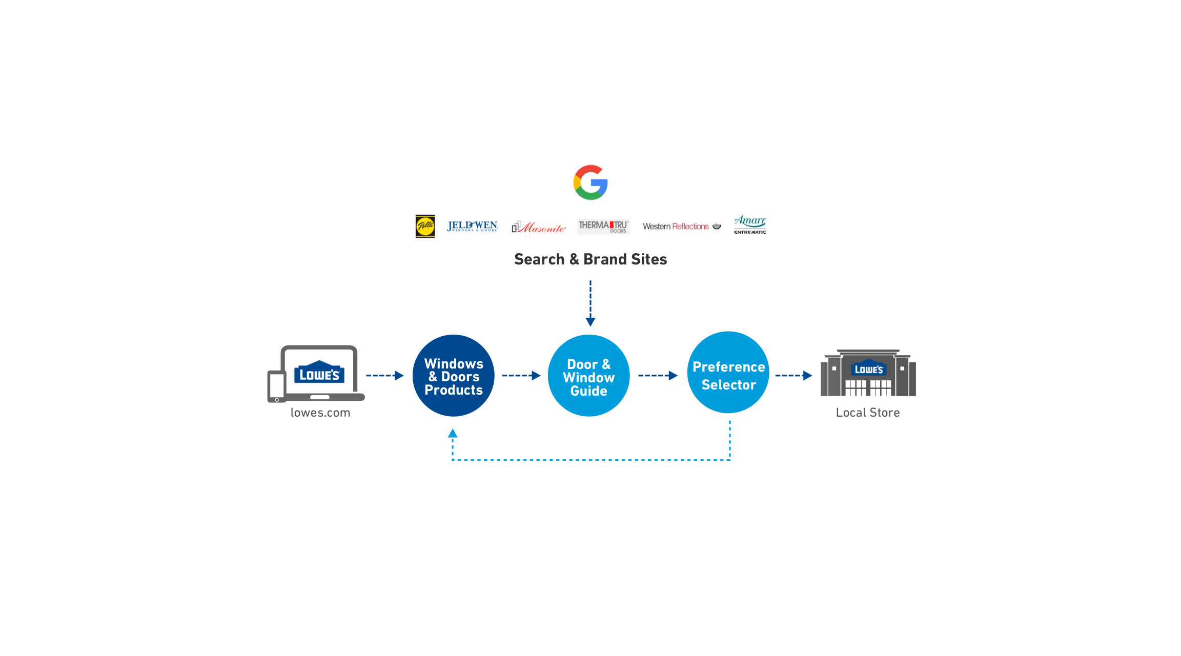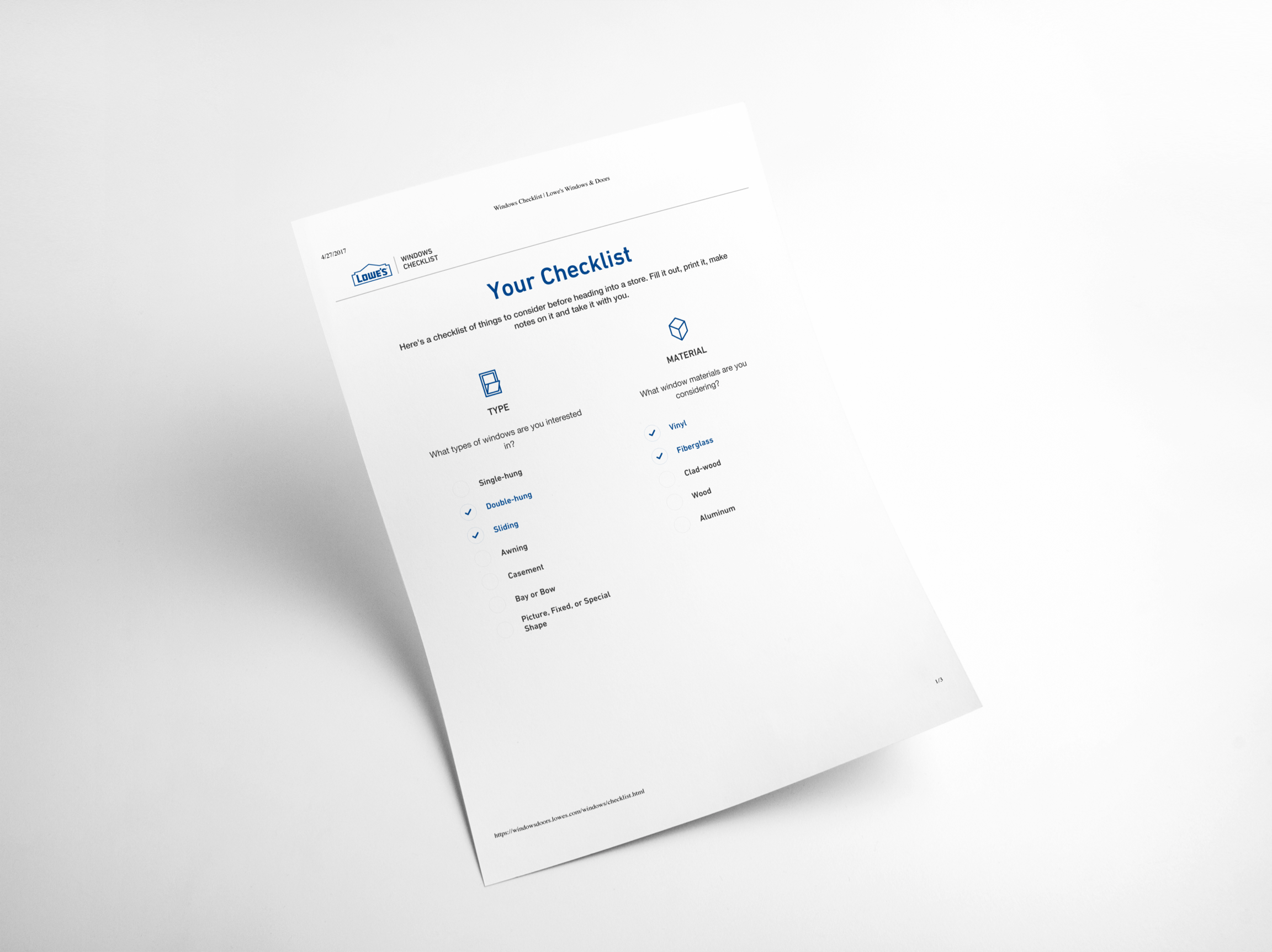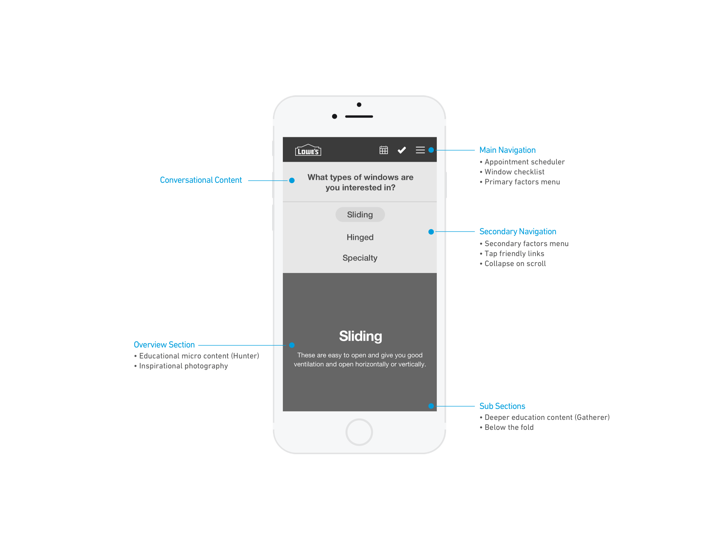 Through customer research and stakeholder workshops, we realized that shopping for windows and doors can be an overwhelming experience. With high uncertainty, users preferred going in-store to truly evaluate the look and feel of their window or door. As the majority of users start their research online, we identified key entry points into the experience. We created a simple, responsive guide that provided a balance between form and function, style and utility. Through a lightweight experience, we broke down primary and secondary buying factors. We focused on translating highly technical terms into user-centric language. Allowing customers to take a mobile checklist along with them, we provided a “soft landing” into a local Lowe’s store where they could confidently share ideas and buying preferences with a Lowe’s expert.