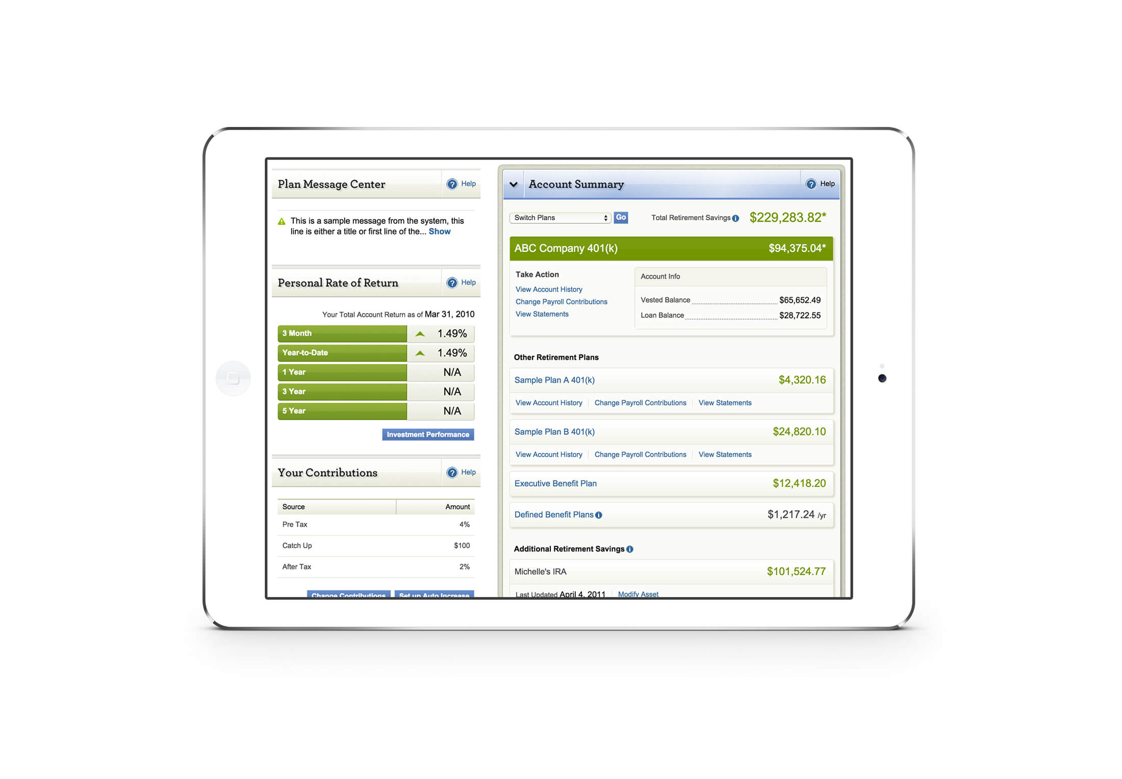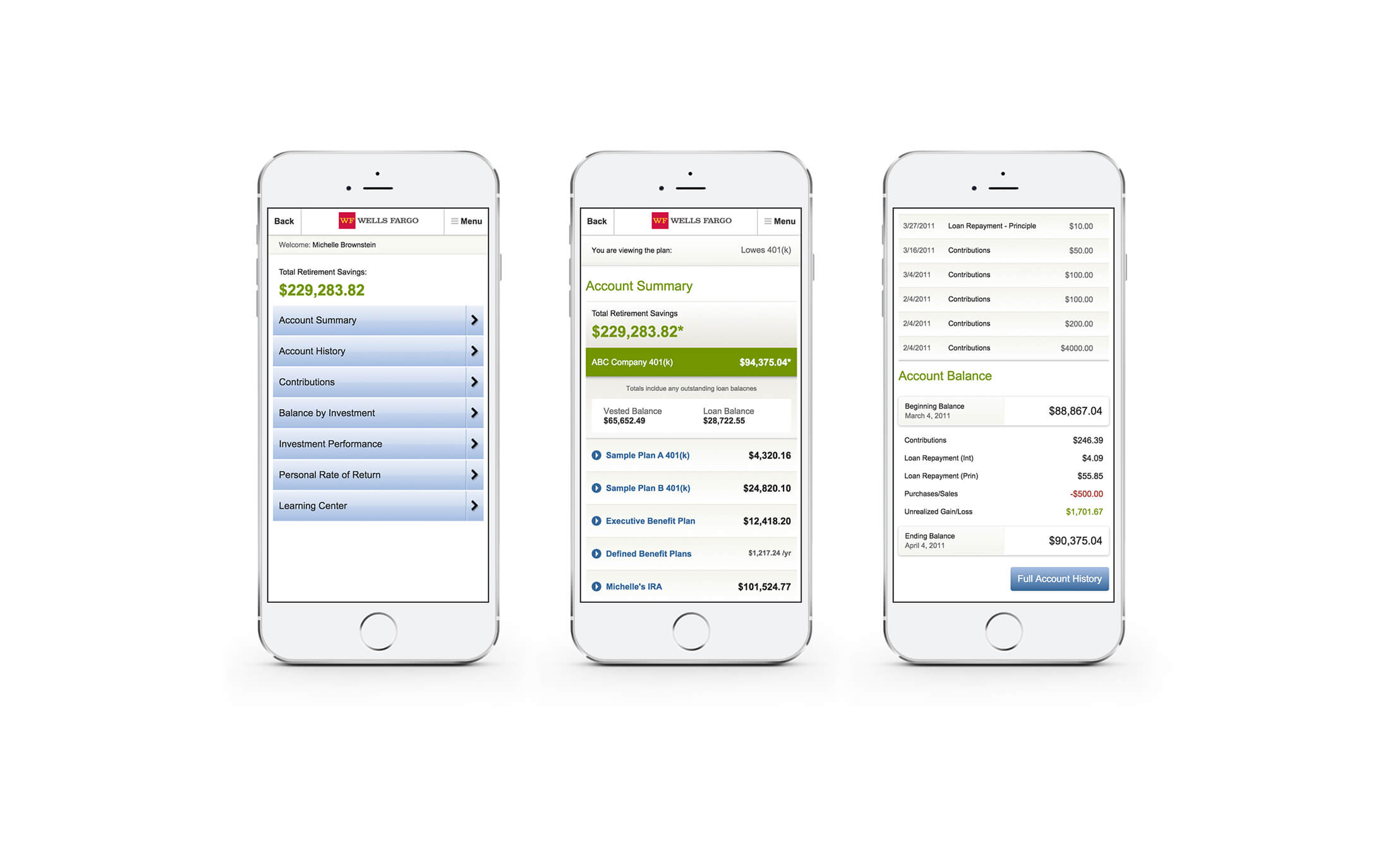 In 2010, I concepted and designed the experience that landed the Wells Fargo Retirement account. As ideas evolved, our team reimagined the online account center, including a dashboard with new features for better account management. The features included: A setup wizard tailored for both beginner and advanced 401(k) participants (2 different experiences), ePreferences, Personal Rate of Return, Account History, Balance by Investments, Withdrawals, and Fund Transfers (transferring of multiple funds). Every user flow was designed, prototyped, tested, and iterated upon. In 2013, our team worked closely with IBM to provide a responsive mobile solution.