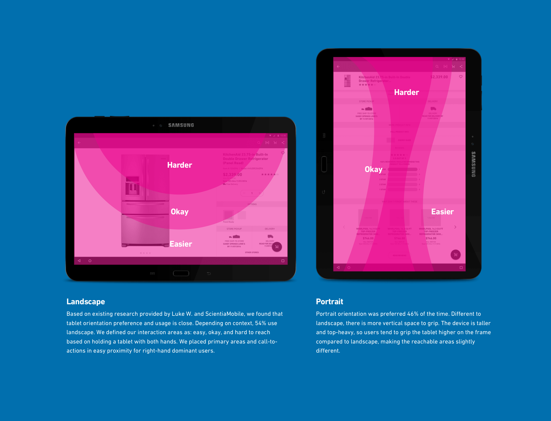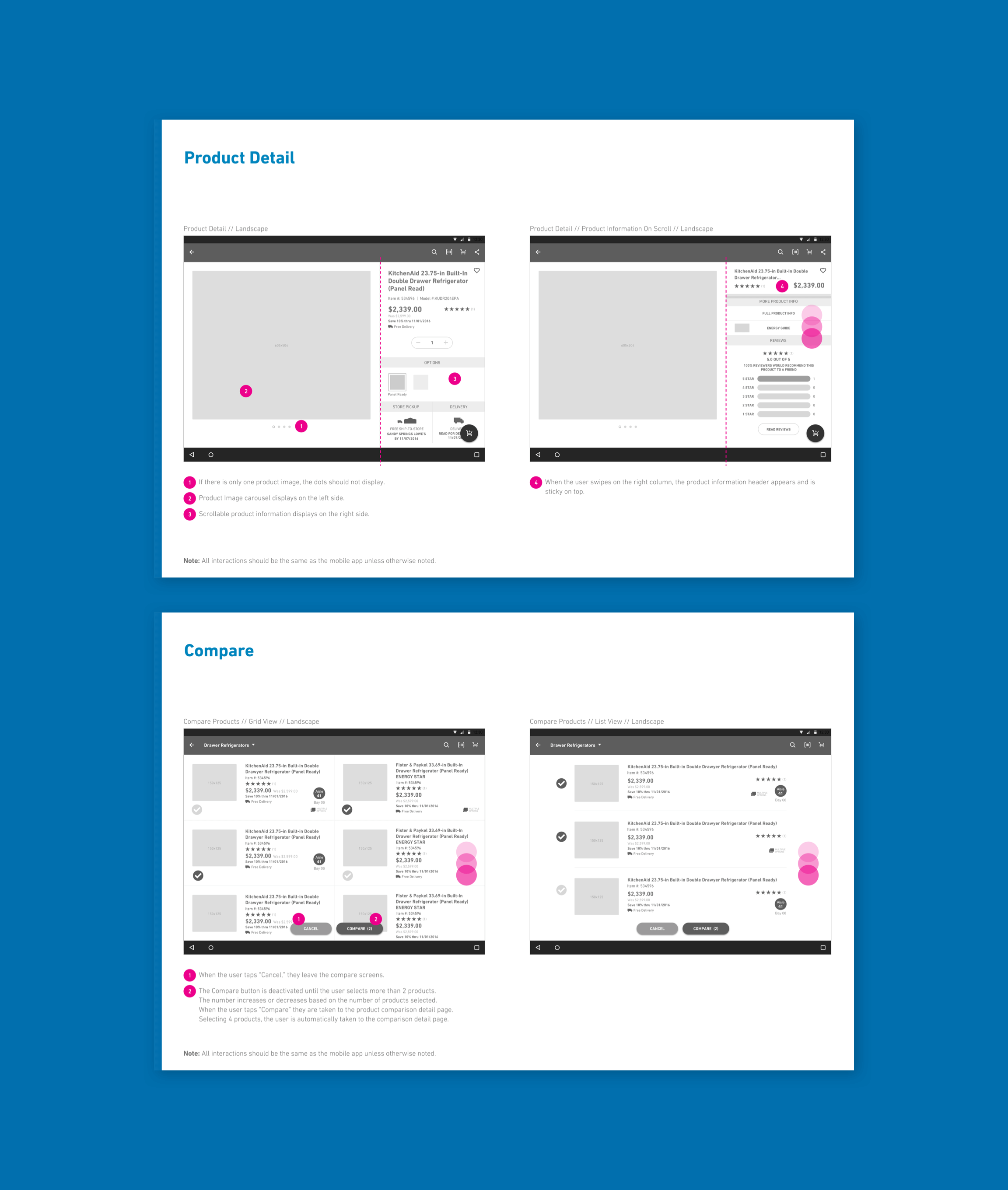 Our goals were straightforward: leverage available screen space, use adaptable layouts for varied tablet sizes, provide utility for product information, and discover opportunities for larger product imagery.