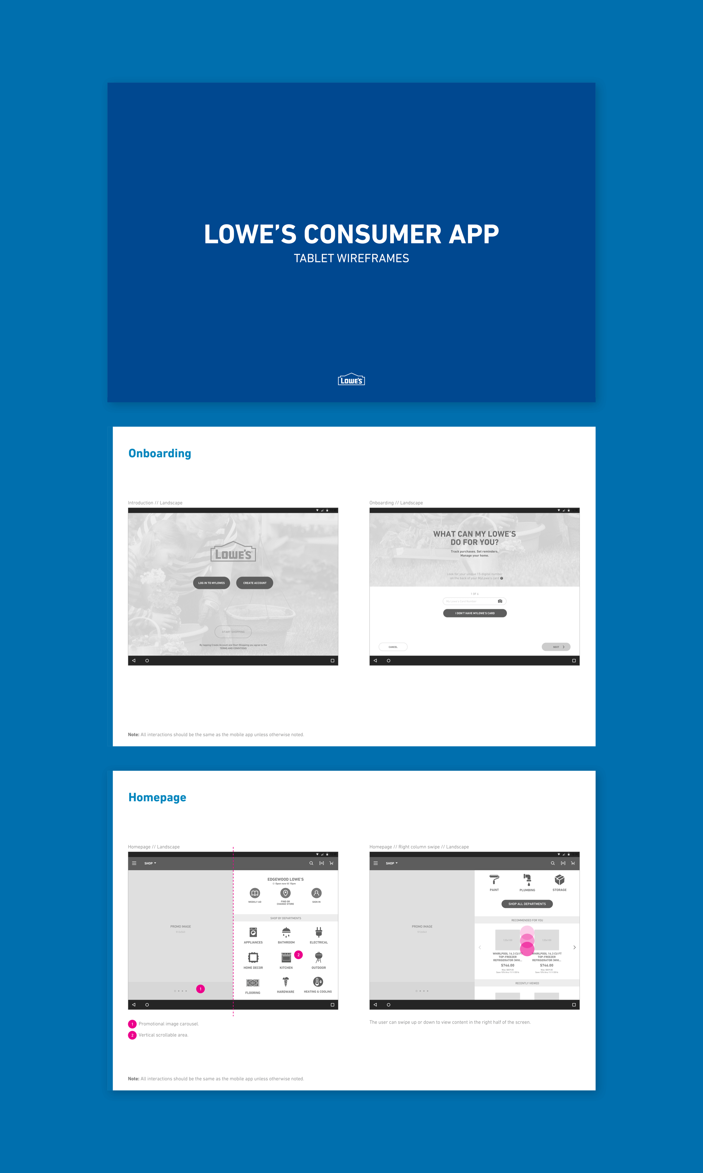 My role on this project was to design the full tablet experience (wireframes and annotations). I guided two Interaction Designers along the way, while meeting directly with a Lowe’s product manager, business analyst, and software engineers.
