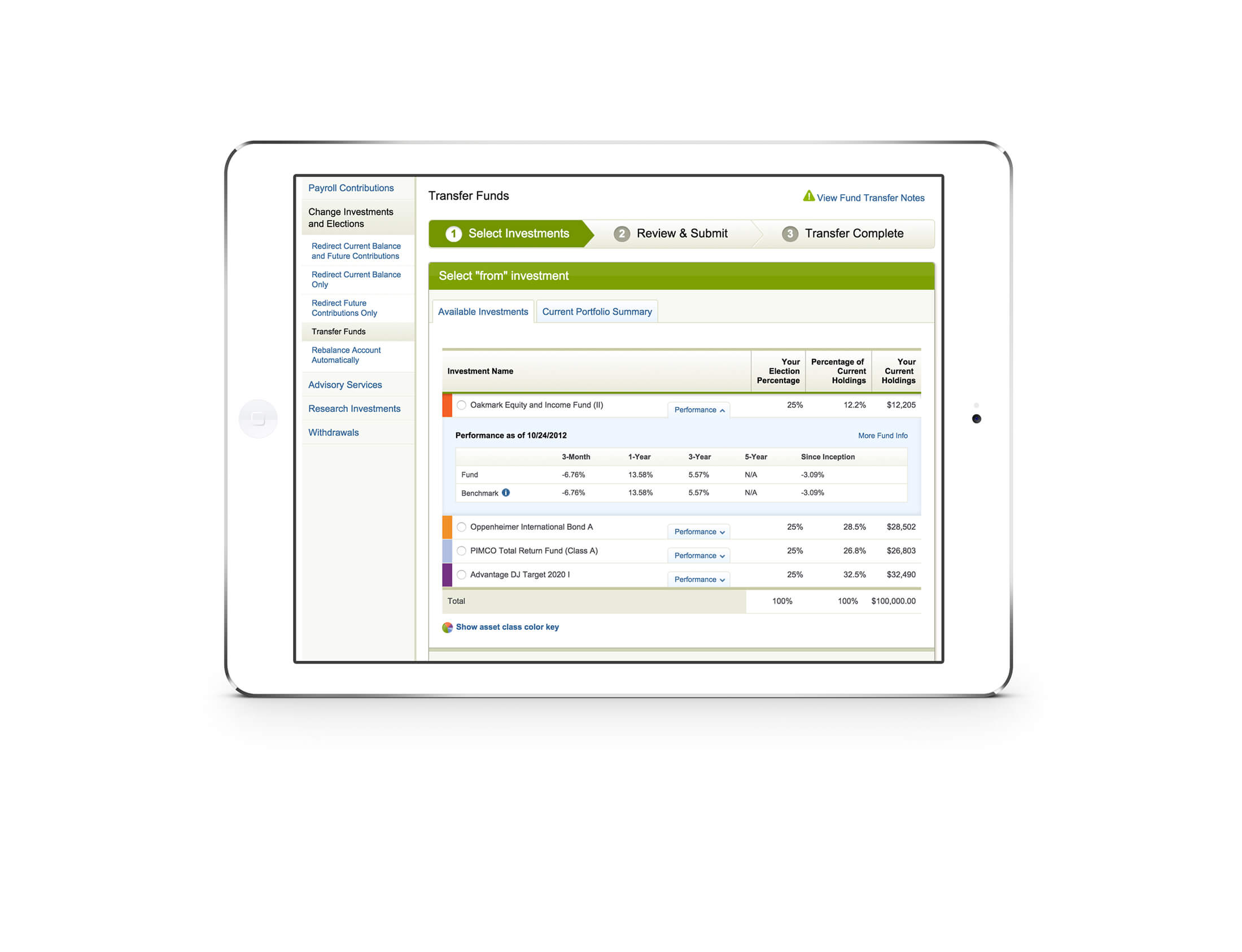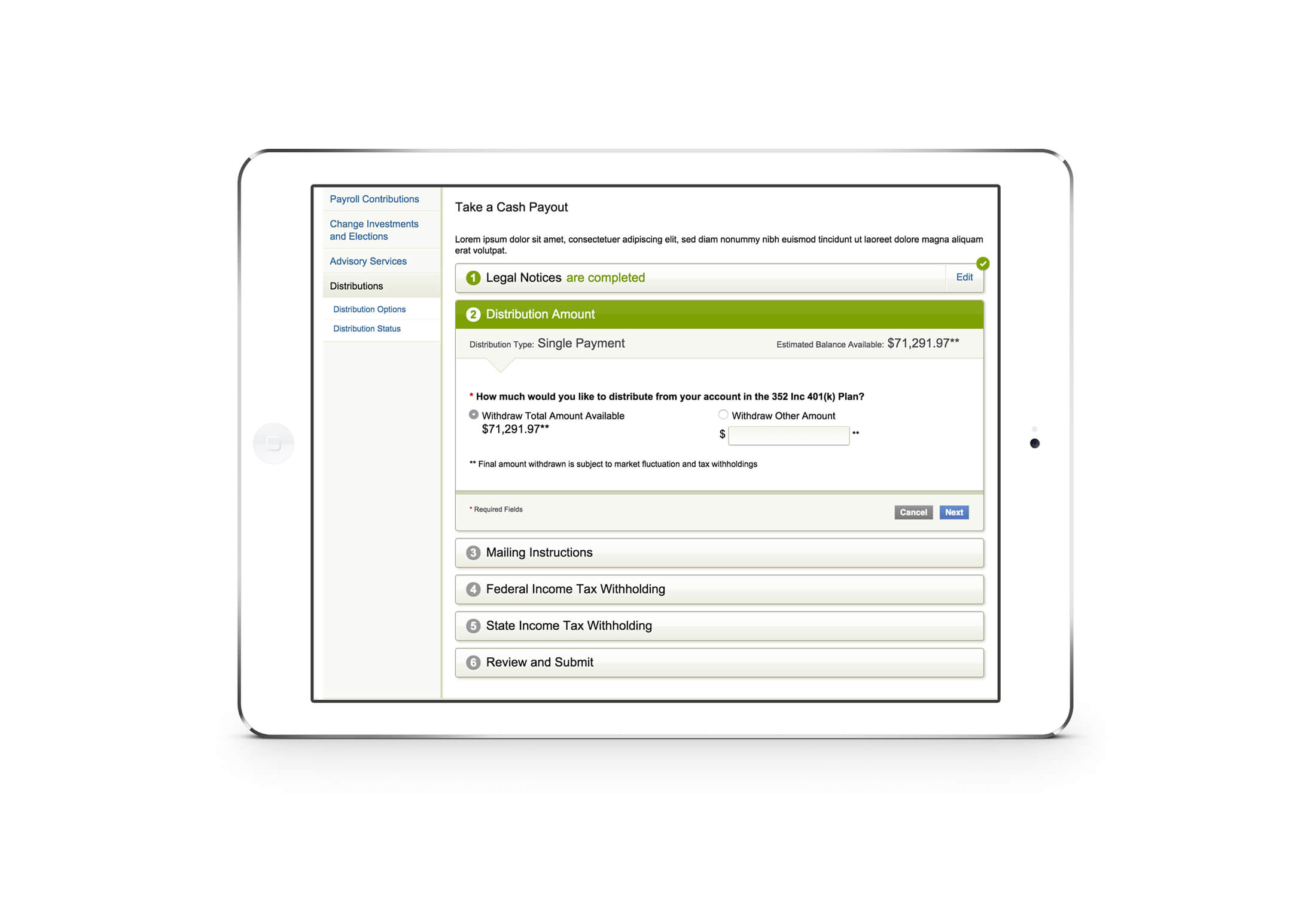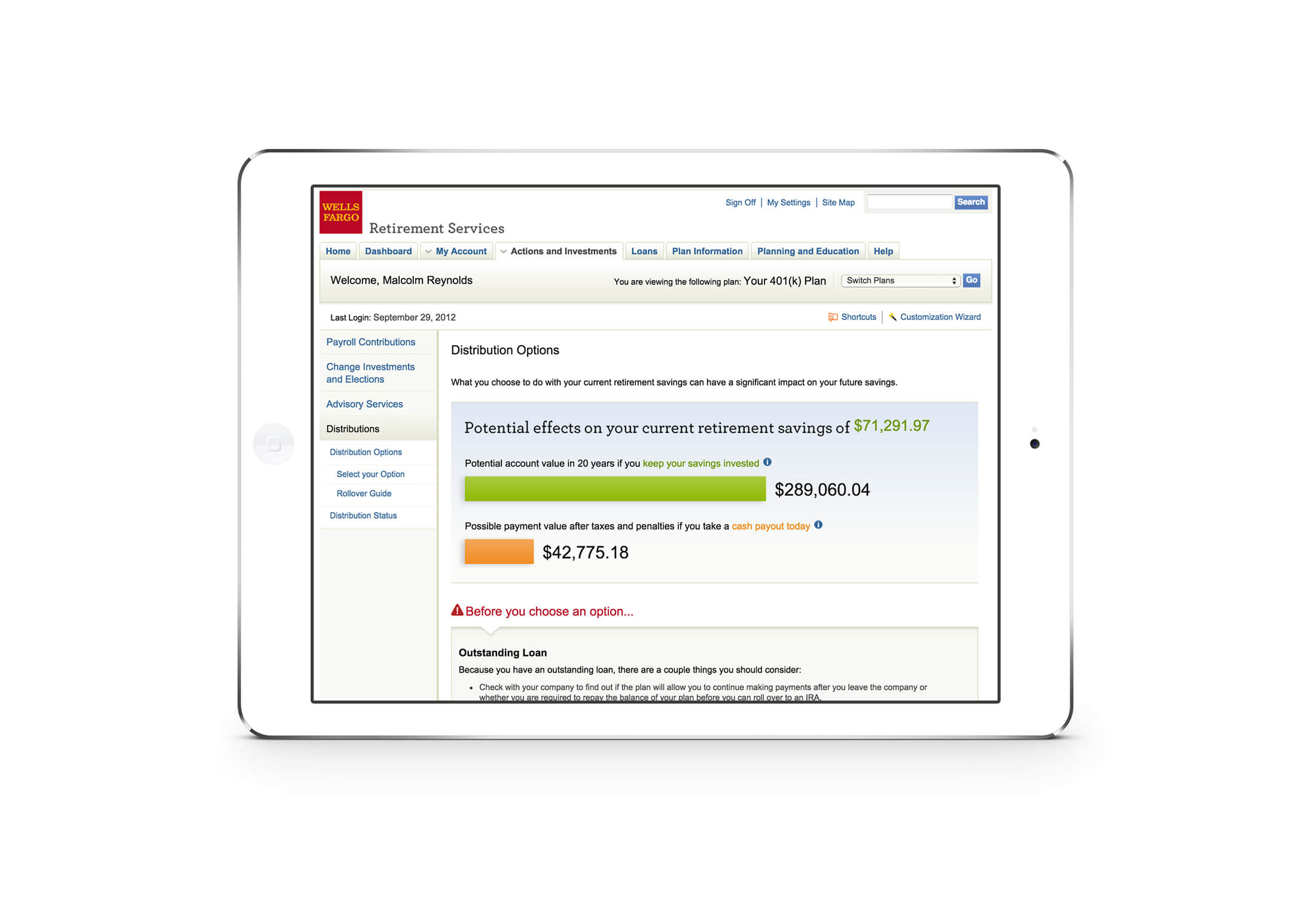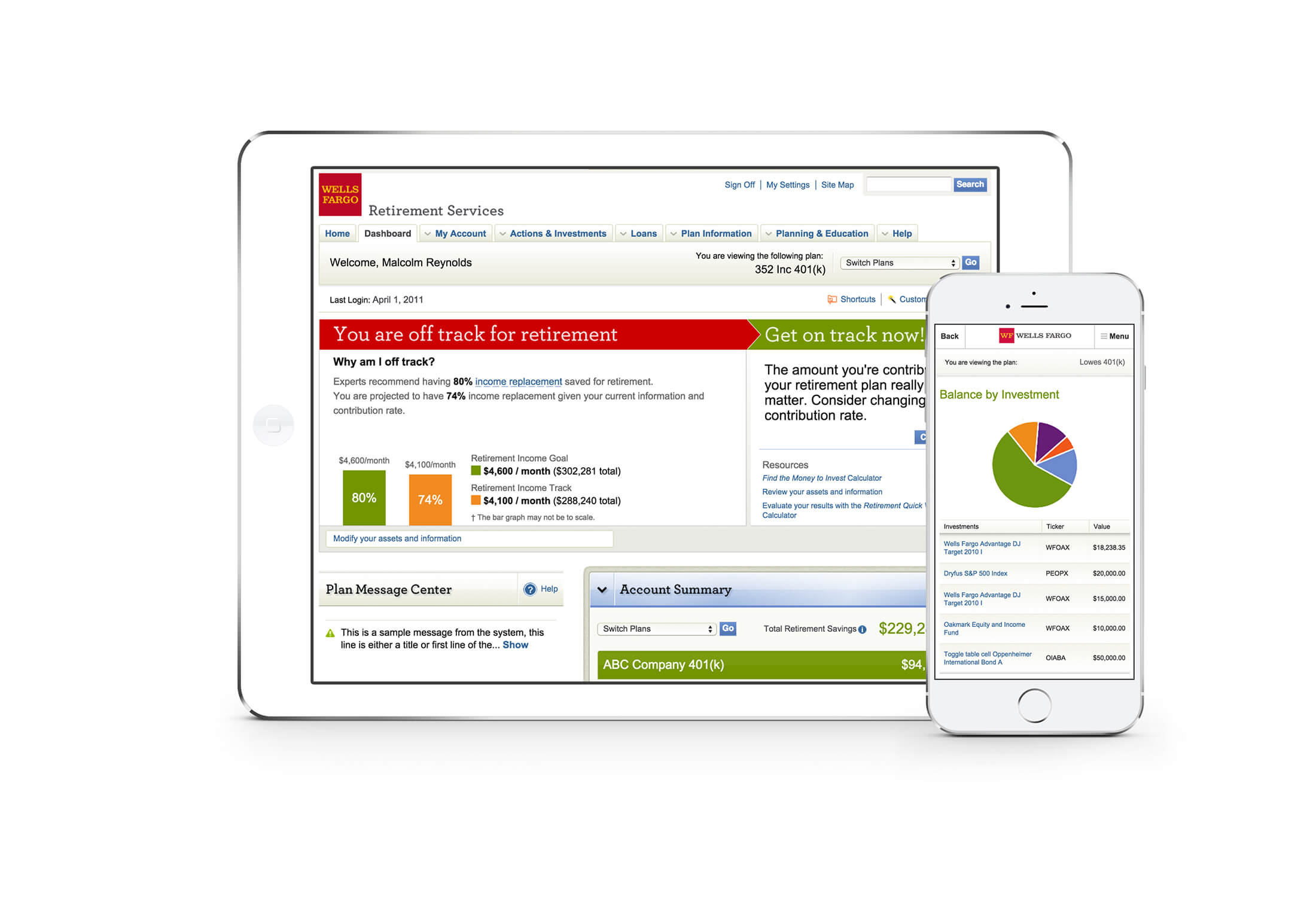 In 2010, I concepted and designed the experience that landed the Wells Fargo Retirement account. As ideas evolved, our team reimagined the online account center, including a dashboard with new features for better account management. The features included: A setup wizard tailored for both beginner and advanced 401(k) participants (2 different experiences), ePreferences, Personal Rate of Return, Account History, Balance by Investments, Withdrawals, and Fund Transfers (transferring of multiple funds). Every user flow was designed, prototyped, tested, and iterated upon. In 2013, our team worked closely with IBM to provide a responsive mobile solution.